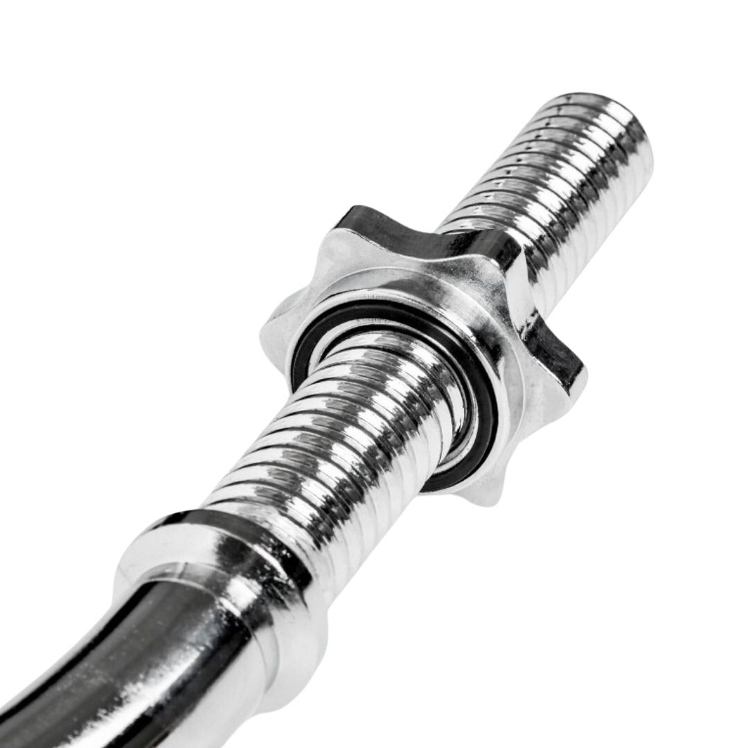 Fabricada en acero cromado de alta resistencia, ofrece durabilidad, un acabado estético y un agarre firme gracias a su mango moleteado. Además, incluye seguros tipo mariposa que aseguran los discos de forma rápida y estable, brindando mayor seguridad durante el entrenamiento.