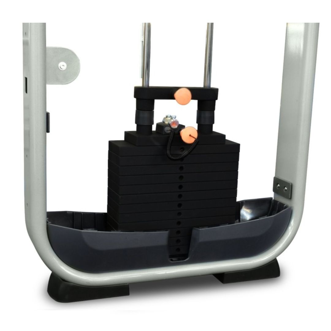 Contrapeso. 88.4 kg en placas de acero sólido. La placa de peso superior está equipada con bujes autolubricantes. El pasador selector de peso se bloquea magnéticamente en su lugar y se conecta al stack para evitar pérdidas. Incluye un sistema de peso incremental desplegable de 3.4 kg.