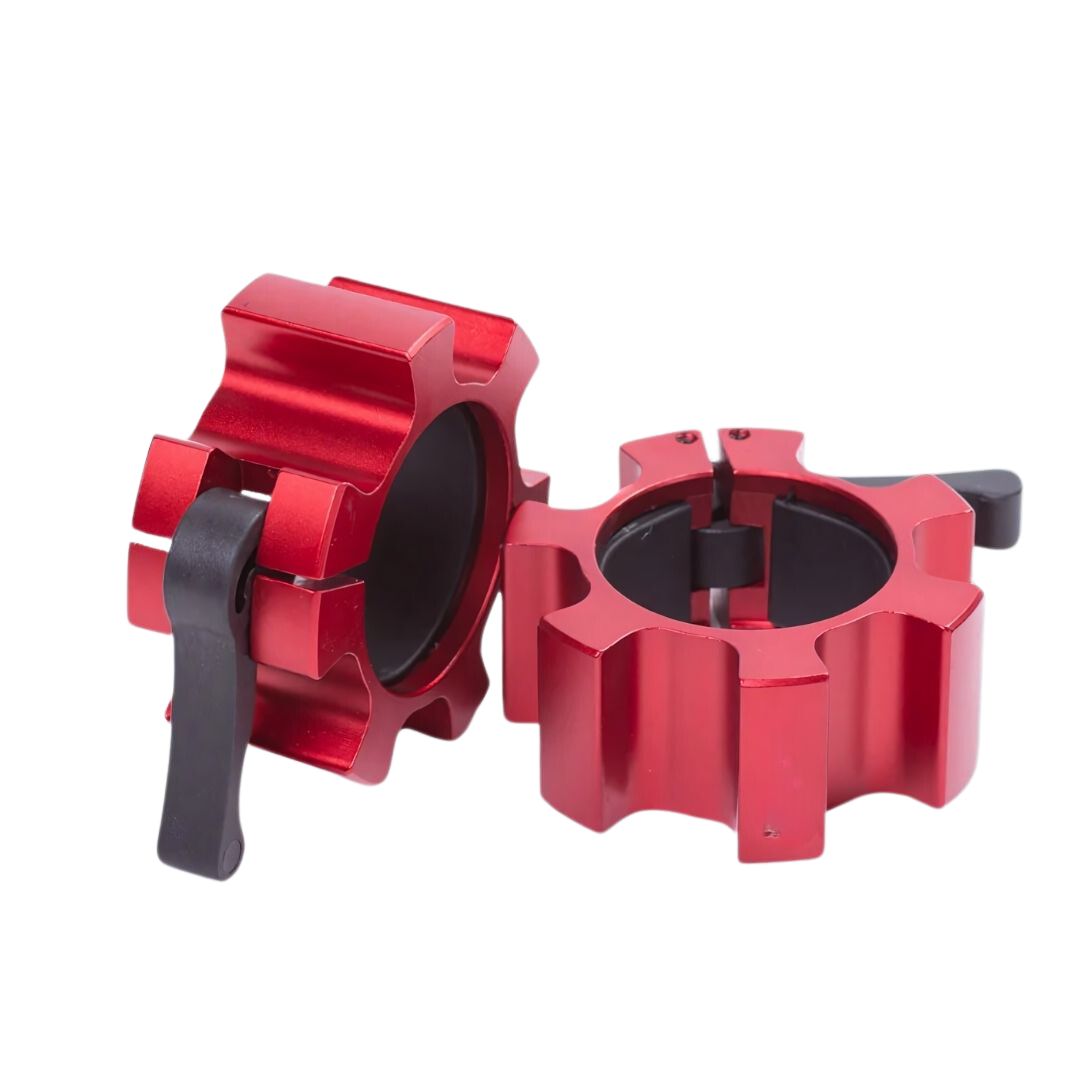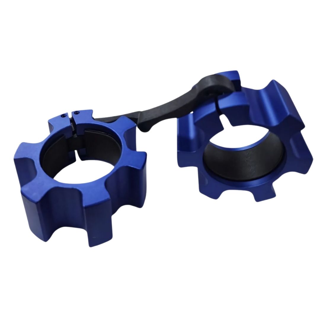 Los collarines de aluminio olímpicos están fabricados con material de alta resistencia, diseñados para soportar caídas repetitivas y de alto impacto, durando mas años que los collarines de plástico. Poseen un cierre resistente de fácil acción, con un bloqueo y desbloqueo rápido permitiendo un cambio de discos con el menor esfuerzo. Poseen un forro interior de goma de alta tensión, que proporciona un agarre 4 veces mayor que los collares de plástico. Mantendrán los discos bloqueados sin movimiento. Los collarines están diseñados para usarse con cualquier barra olímpica que posea un diámetro de 50 mm.
