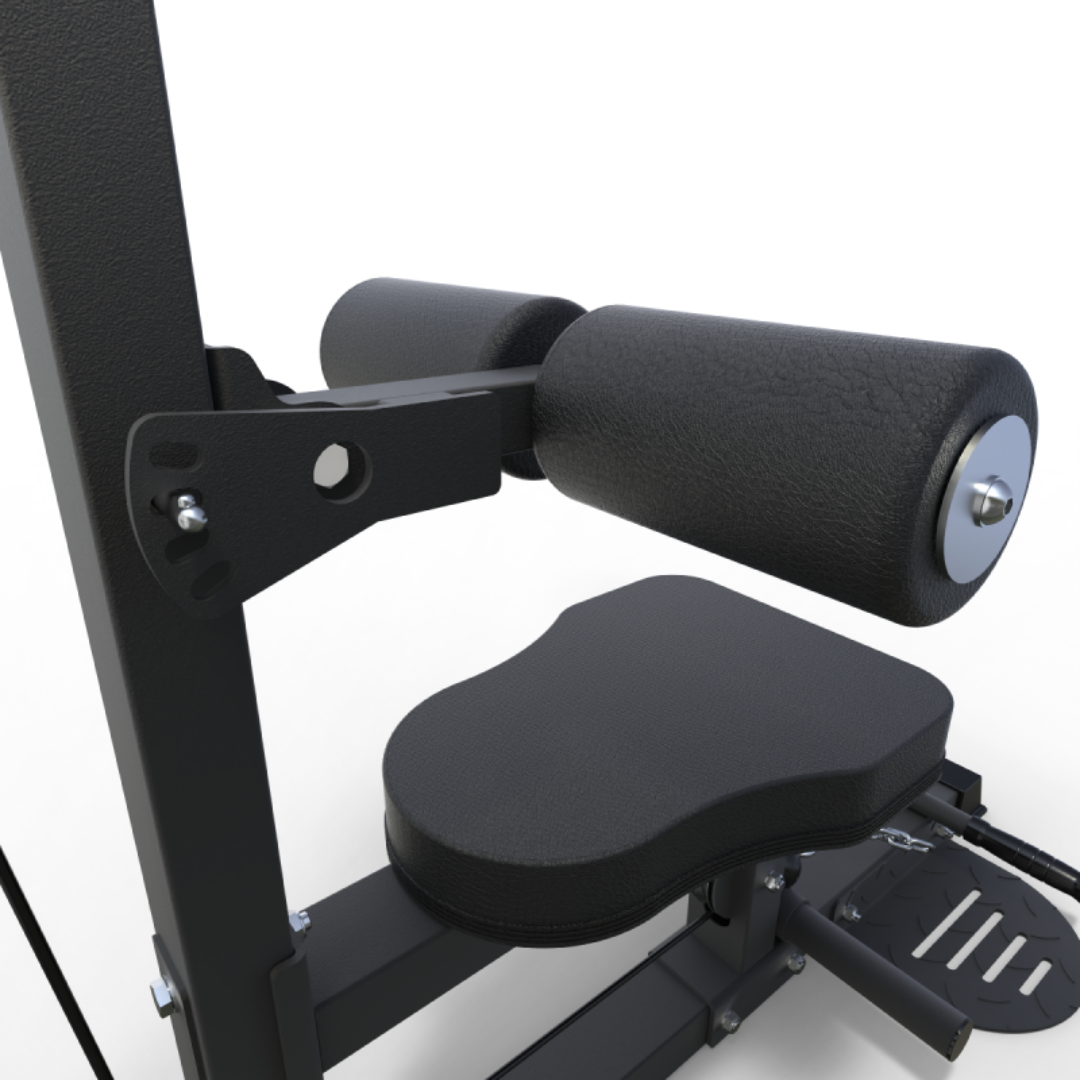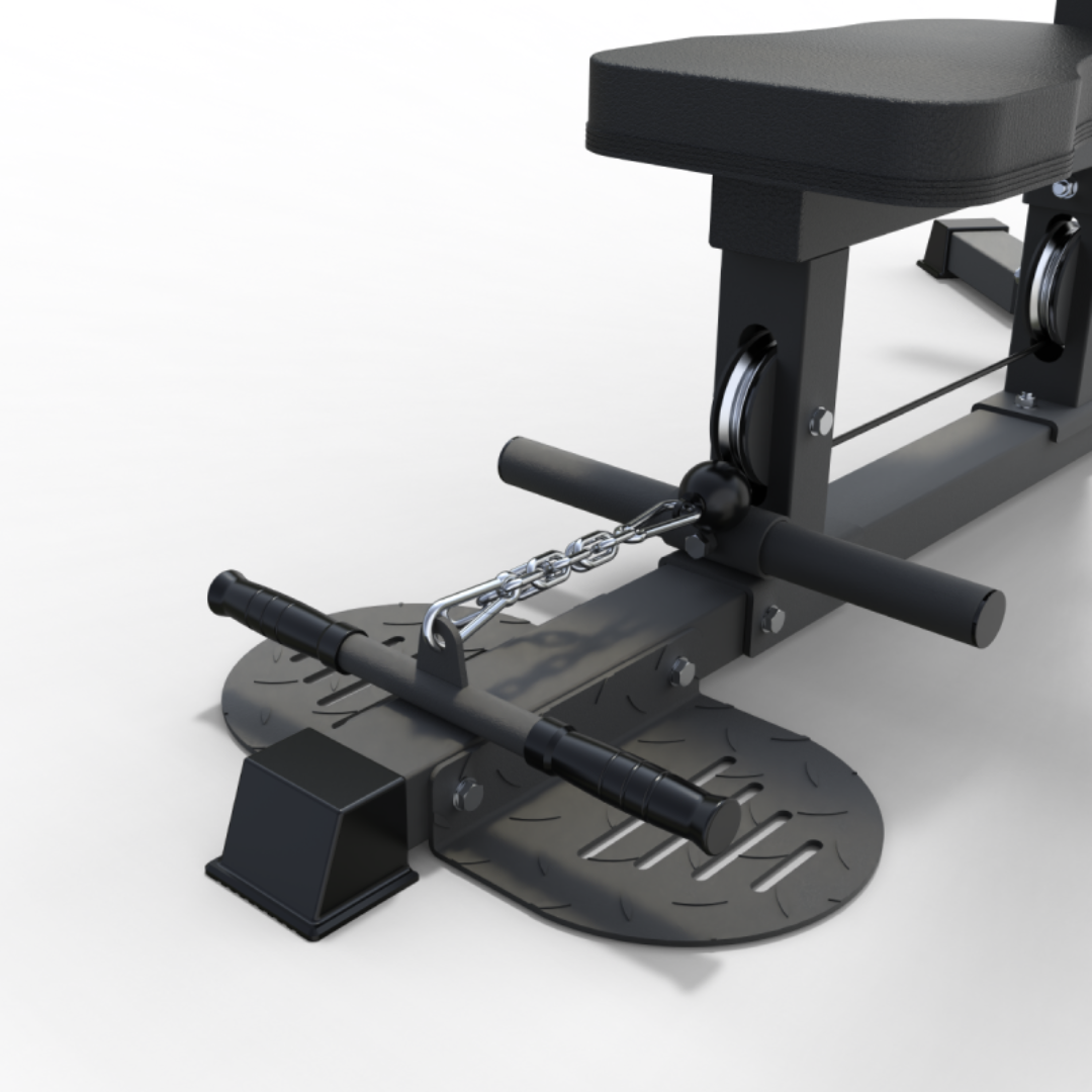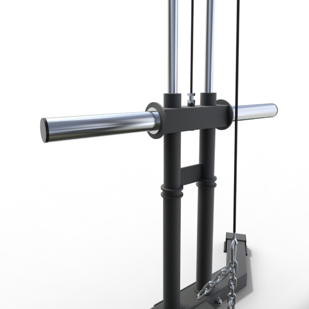 Construida con acero de alta resistencia de 50*70*2 mm, garantiza una estabilidad inquebrantable con una impresionante capacidad de carga de hasta 100 kg., con una relación cable/polea de 1:1. El corazón de la máquina es su sistema de cable profesional con rodamientos de bolas y rodillos de aluminio, que asegura un deslizamiento fluido y sin fricción en cada repetición.